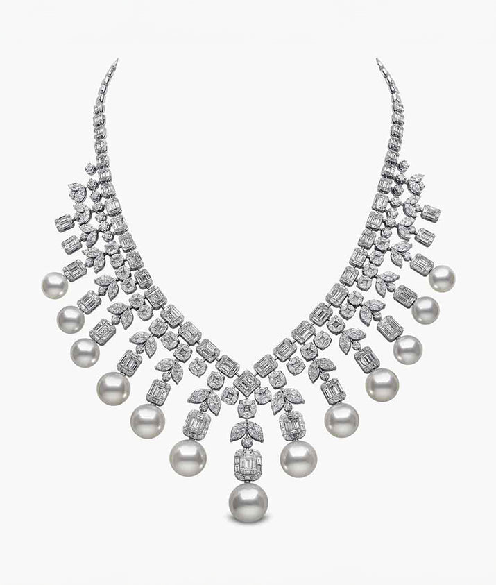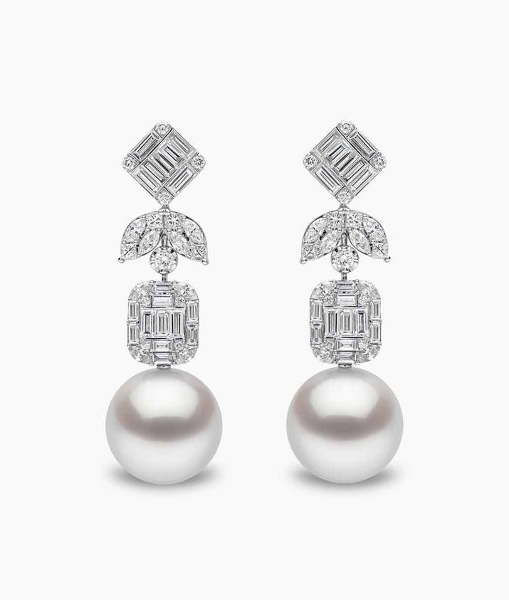 Intricate diamonds suspended by 18K gold, each drop pearl is meticulously set to create an ornate masterpiece, reflecting the intricate beauty of aristocratic charm and refinement.