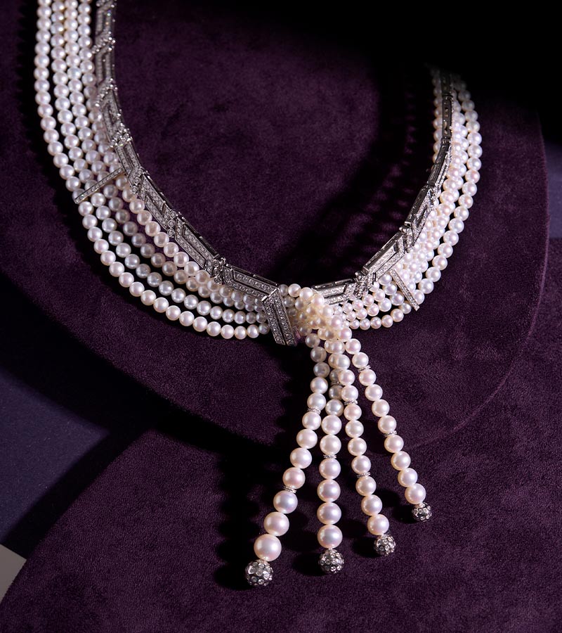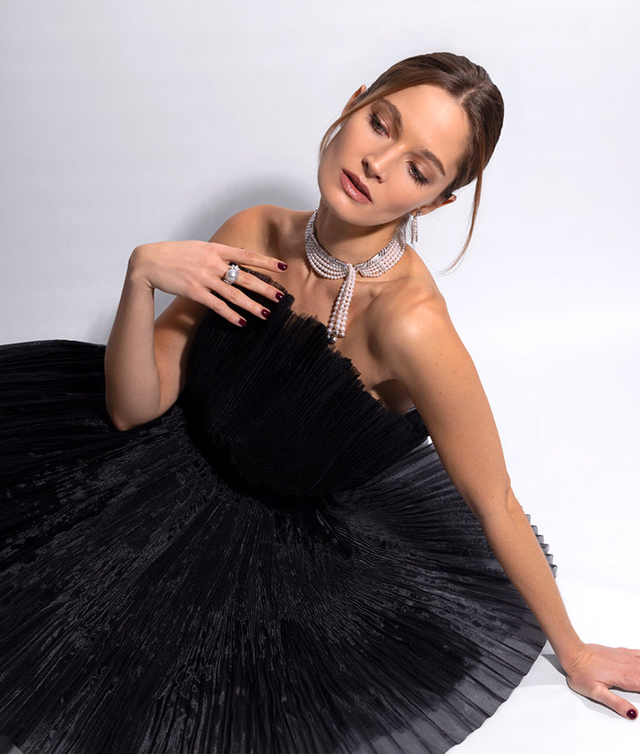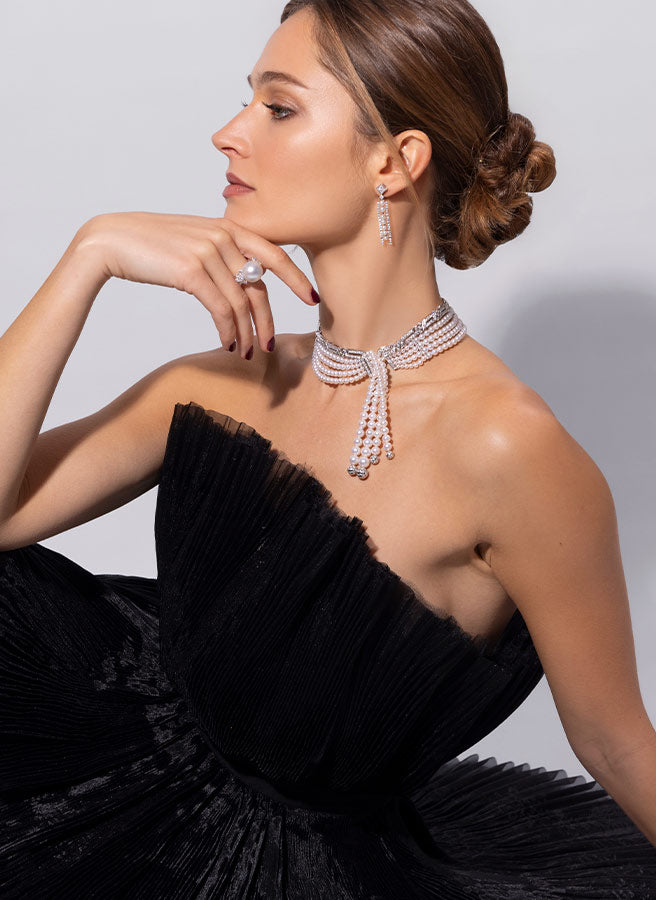 The signature pearl tassel brings the choker to life, catching every glimmer, and creating a mesmerising play of light. The effect is theatrical yet sophisticated, offering a moment of pure glamour with each step.