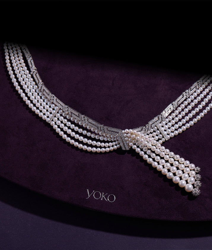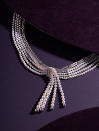 Inspired by regal femininity, the Cleopatra choker reinterprets a timeless silhouette with contemporary artistry. Multiple rows of luminous pearls embrace the neck, while a cascading tassel introduces movement, fluidity, and undeniable opulence.