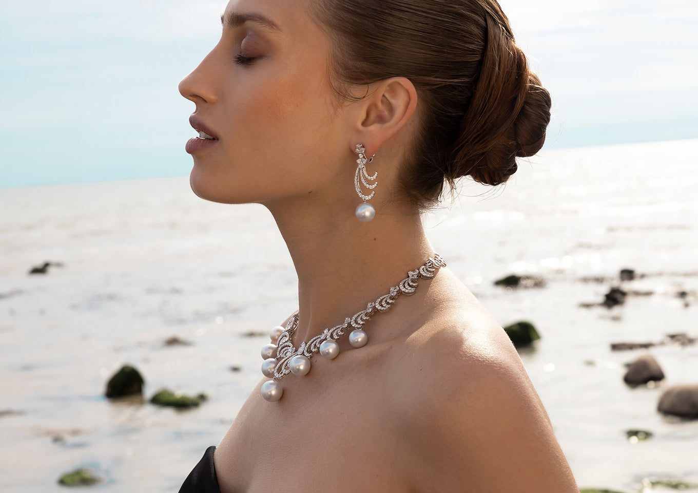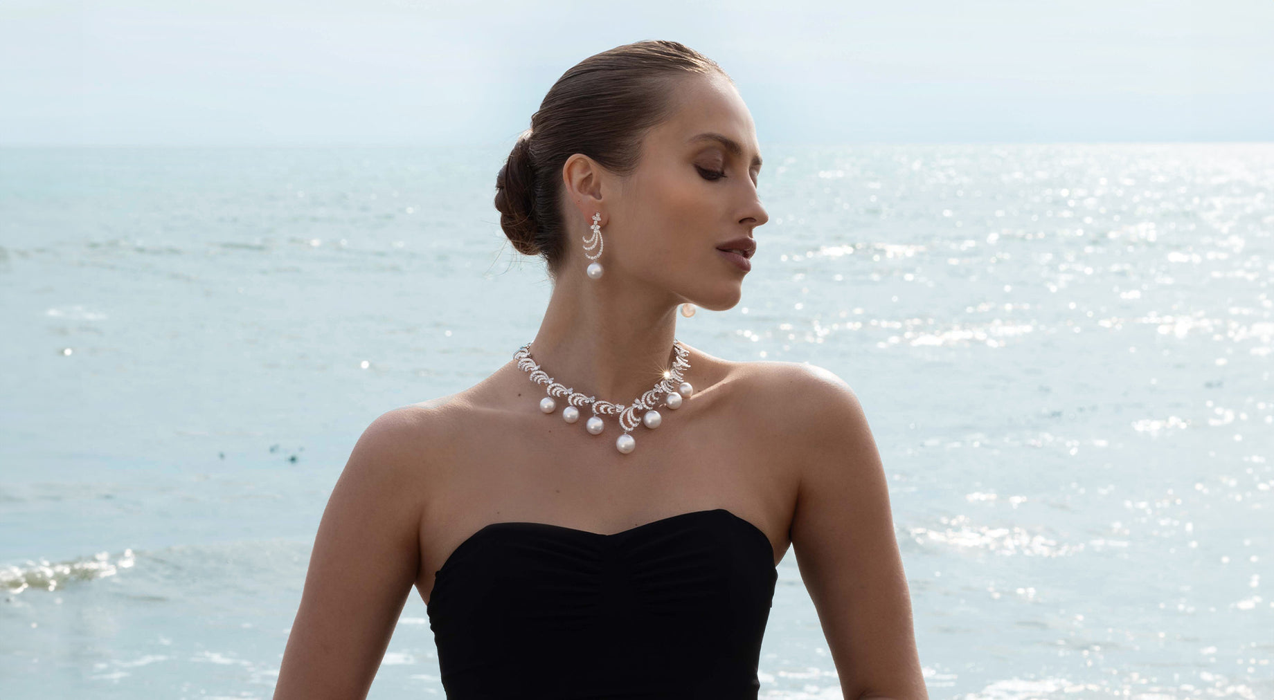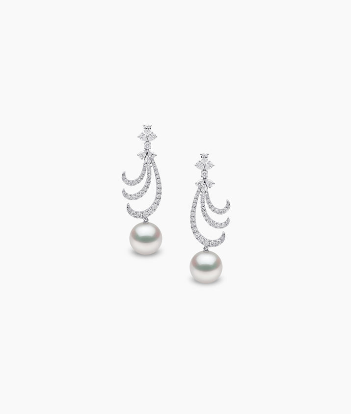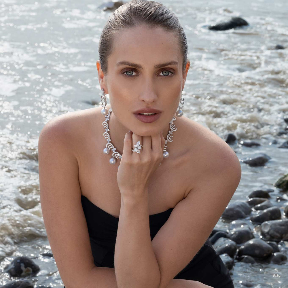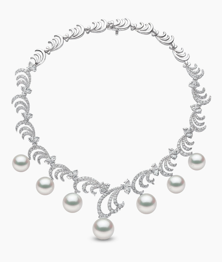 Our dazzling Whisper masterpiece features luminous South Sea pearls beneath scintillating diamond curves in a pairing that is simultaneously striking but delicate. This elegant, ornate necklace is the perfect statement piece.