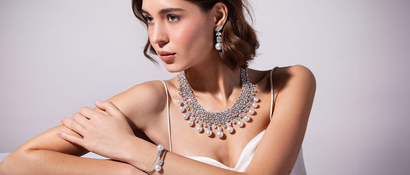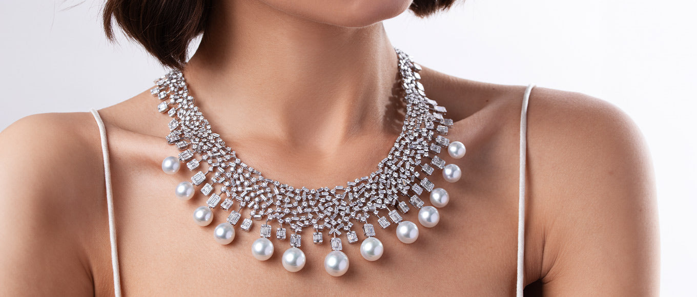 Indulge in an opulent tribute to refinement and grace, drawn from the grandeur of royal lineage. Enter a realm where contemporary allure intertwines with noble sophistication. Behold the resplendent tapestry of scintillating diamonds intertwined with the luminescence of South Sea pearls, forming celestial constellations of elegance and allure.